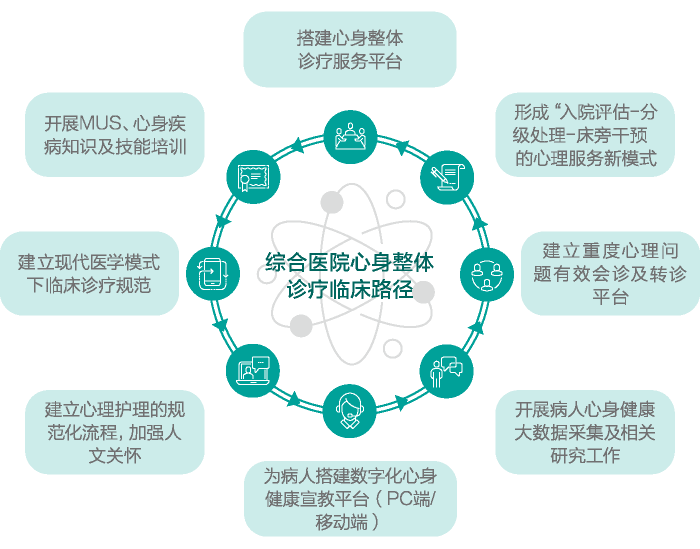 现代医学模式与WHO健康新概念早已提出,综合医院需要对患者进行生物、心理、社会三位一体综合分析评估、对疾病实施心身整体诊疗服务。对于MUS不进行心身整体诊疗,就无法实现心身同诊同治,就无法达到满意的临床效果;对躯体疾病伴发心理问题,如不及时发现与处理,就会影响疾病康复,增加隐患与风险。发展心身整体诊疗技术、建立心身整体诊疗服务模式已是大势所趋、当务之急。