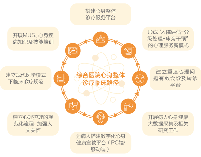 现代医学模式与WHO健康新概念早已提出,综合医院需要对患者进行生物、心理、社会三位一体综合分析评估、对疾病实施心身整体诊疗服务。对于MUS不进行心身整体诊疗,就无法实现心身同诊同治,就无法达到满意的临床效果;对躯体疾病伴发心理问题,如不及时发现与处理,就会影响疾病康复,增加隐患与风险。发展心身整体诊疗技术、建立心身整体诊疗服务模式已是大势所趋、当务之急。